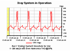 Ideally, an online UPS represents the best solution when protecting against low frequency / high energy events such as >out-of-phase transfers (capacitor bank switching represent similar problems). The challenge was dealing with the size and shape of the inrush currents the X-ray demands as it cycles through its program (See Figure 2). Not only did current rise from 20 Amps to 100 Amps (380V system), but even harmonics with a THD of 65% were present. The added challenge was that this Xray procedure represented “invasive” techniques as cathoders are inserted into arteries, sometimes into the heart.