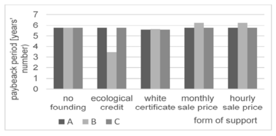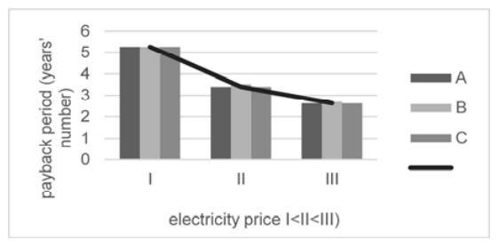 The energy purchase cost was calculated assuming the current average price per MWh (including distribution), i.e., PLN 1000/MWh as variant I and PLN 1500/MWh as variant II. The energy sales price was adopted the same way as in the case of enterprises. It was decided to calculate a simple payback period. Yet, it would be advisable to consider the discount rate in the analyzed periods. The payback period is not the subject of consideration but only its comparison between individual variants. The time factor was not considered due to its dynamic nature and difficulty estimating changes over the last year.
