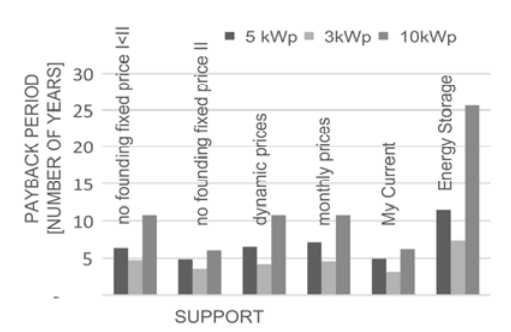 The settlement mechanism intended to prevent over-dimensioning of the installation works appropriately (Fig. 5). Each analyzed variant’s payback period for a 10 kWp installation is significantly longer. From the point of view of proper network operation, additional subsidies for energy storage installations are an essential supporting measure. Unfortunately, despite increasing funds for this purpose, an installation with storage still has a more extended payback period than an installation without it. The payback period is extended by at least one year. For prosumers’ motivation to make such investments, the opportunity of funding should be increased, e.g., to 70% of the costs.