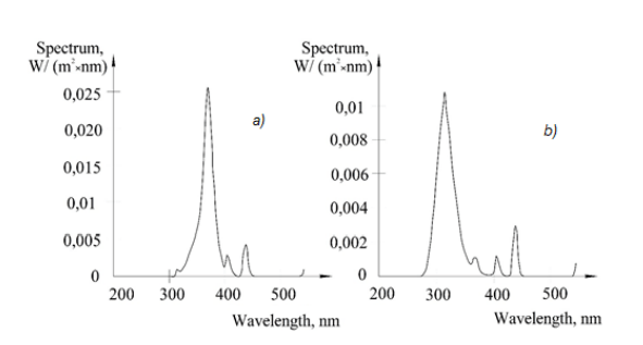 The results of measuring the spectral irradiance (W/(m2.nm) of LUF 40-1 and LE 15 lamps in the wavelength range of 200-500 nm are shown in figure 2.