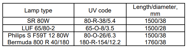 UV – code of the LUF 40-1 lamp: 40-O-4.0/3.6, where 40-O is a lamp without a reflector, with a power of 40 W; 4.0 – effective erythemal irradiance at a distance of 0.25 m in the spectral range of 250–400 nm; 3.6 – ЕUVB/ЕUVA.