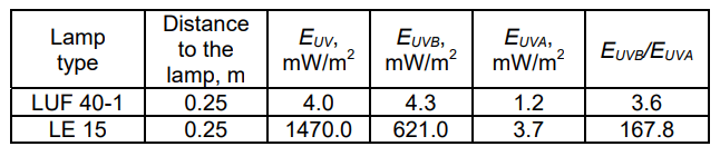 In the studied lamps LUF 40-1 and LE 15 on the marking and in the additional information provided in the technical specifications for lamps LUF 40-1 and LE 15 there is not enough information to determine the equivalence code (UV code) according to IEC 61228 [34]. To determine the codes, it was necessary to measure and calculate the following indicators: total effective erythemal UV irradiation in the spectrum range of 250-400 nm; effective irradiation by the function of significance and carcinogenic – dangerous irradiation in the UVA (λ>320 nm) and UVB (λ<320nm) spectrum ranges; determination of the ratio of effective irradiance (irradiance) ЕUVB/ЕUVA.