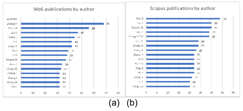 The author analysis reveals significant differences between WoS and Scopus databases (see Fig. 11). In WoS database, three leading positions were obtained by Zhang Y, Chen X and Liu Y. In Scopus database, the leading positions were obtained by Han Z, Xu X., Guizani M. In Scopus, Zhang Y obtained the ninth position. And, vice versa, in WoS Han Z obtained the 10th position.