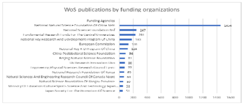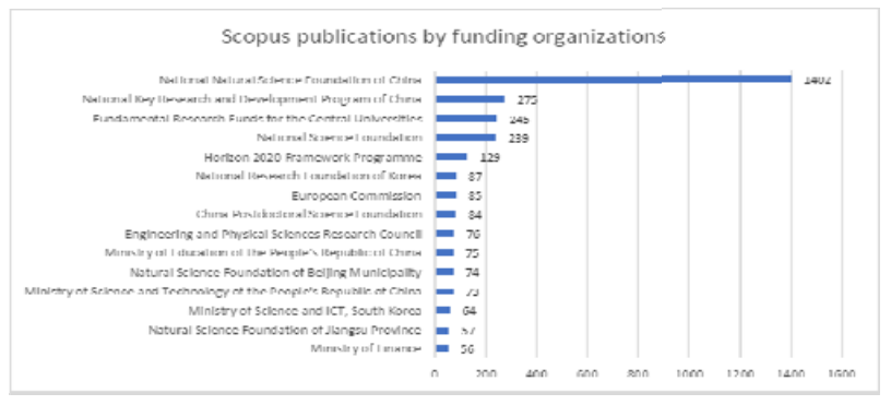 A great amount of research was funded by Chinese organizations such as the National Natural Science Foundation, National Key Research Development Program, China Postdoctoral Science foundation, Beijing Natural Science foundation etc. (see Fig.12,13). The huge advantage of the National Natural Science Foundation was noticed. 247 papers were funded by the National Science Foundation from the USA. More than one hundred research were founded by European Commission. 129 of Scopus publications were funded in terms of the Horizon 2020 Framework Program.