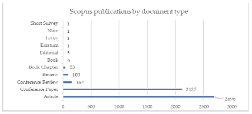 First, the analysis by publication type was conducted. The most popular type of publication was original article and conference/proceedings paper according to both databases (see Fig. 1, 2). Moreover, according to WoS the 53 book chapters, 162 conference reviews, 103 reviews and six books were published as well. The number of book chapters occurring in Scopus database was smaller. 0 books and just 3 book chapters were published. The number of review articles was similar and counted 94 papers.