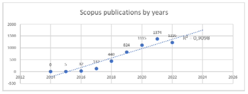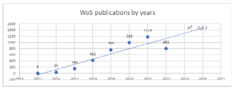 In the next step, the publication analysis in dynamics from 2014 to 2022 was done together with the prediction till 2024 year by forecast linear trend line application (see Fig. 3,4). Although the beginning of the publication period in the WoS and Scopus databases was recorded only in 2015, the increase in number of publications was rapid. In 2021, it exceeded 1 thousand papers.