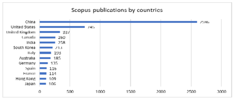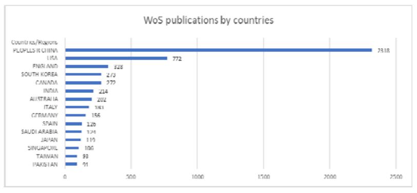 Analyzing the publications by countries, the comparable results were extracted from both databases (see Fig.5,6). The huge advantage of China was noticed; more than 2300 publications. Its contribution was several times greater than other countries. The second place obtain the USA, the third – England/United Kingdom.