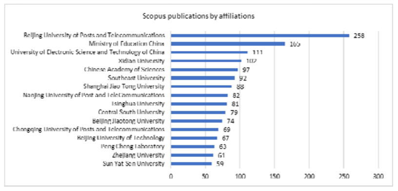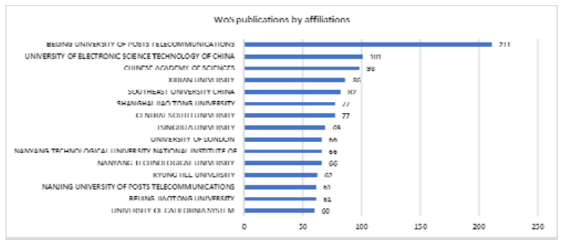 China’s scientific institutions were also the leaders in category by affiliations (see Fig.7,8). The leading position obtain the Beijing University of Posts and telecommunication with more than two hundred publications, which is approximately one tenth of the total number of Chinese publications.