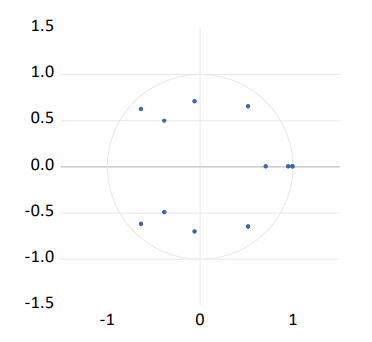 The next step involves determining the optimal lag length for the VECM model. Lag order selection is crucial for obtaining a better model fit. In this study, several common lag selection criteria are utilized, including the Sequential Modified LR Test Statistic (LR), Final Prediction Error (FPE), Akaike Information Criterion (AIC), and Schwarz Criterion (SC). The values obtained for each lag selection criterion are presented in Table 2. Based on the results, the optimal lag length for the VECM model is identified as the fourth lag, and because the data was differencing, the lag used in the next step is 3. This determination is supported by the values of the applied selection criteria, where the lowest values are consistently obtained at the fourth lag, as observed in the LR, FPE, and AIC criteria. Subsequently, the stability of VECM model is assessed. Figure 2 displays the inverted values of the characteristic roots, revealing that the majority of these