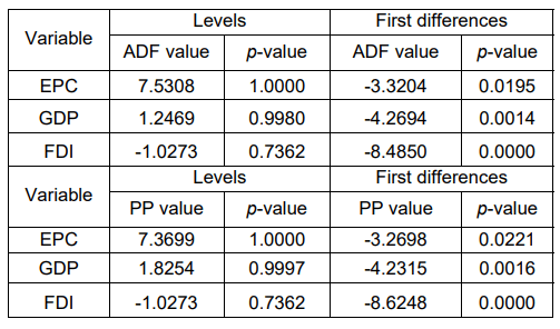 The stationary properties of the observed variables are examined using Augmented Dickey-Fuller (ADF) and Phillips-Perron (PP) tests, and the results are summarized in Table 1. The tests reveal that the variables are not stationary in their levels, as indicated by the p-values exceeding 0.05. However, when tested in first differences, all variables (EPC, GDP, and FDI) exhibit p-values below 0.05, indicating stationarity after differencing (non-stationary data are rejected at a 5% significance level). Therefore, the variables are considered stationary at first differences.