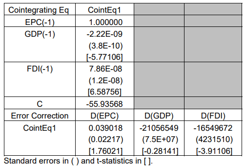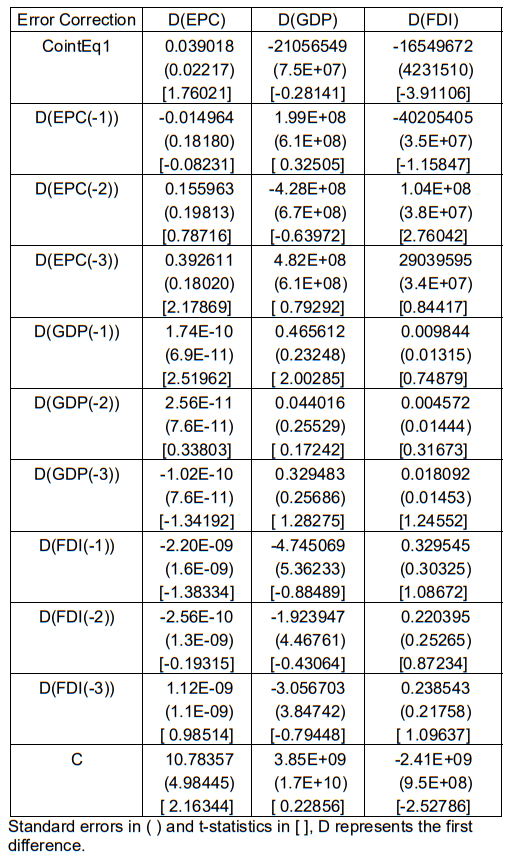 (1) D(EPC) = 0.0390178082912(EPC(-1) – 2.21969292975E-09GDP(-1) + 7.86306945367E08FDI(-1) – 55.9356827521 ) – 0.0149640076872D(EPC(-1)) + 0.155962988885D(EPC(-2)) + 0.392610534548D(EPC(-3)) + 1.7352267132e10D(GDP(-1)) + 2.55642190373e-11D(GDP(-2)) – 1.02109012853e-10D(GDP(-3)) – 2.19749170889e09D(FDI(-1)) – 2.55628964545e-10D(FDI(-2)) + 1.12283147008e-09D(FDI(-3)) + 10.7835707096