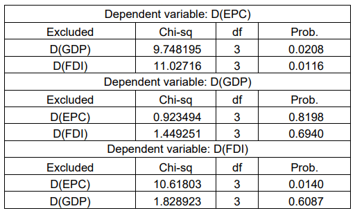 In the final stage of this study, the VECM Granger causality test is applied to the model using the differenced data obtained in the previous step. This test is utilized to examine the short-run and long-run causal relationships between the variables included in the model. Table 4 presented VECM results. The presence of significant coefficients with a negative sign suggests a long-term relationship between the variables, while coefficients with a non-significant negative sign indicate a short-term dynamic relationship [20]. The error correction mechanism reveals a short-term relationship among all the variables. In the long term, there exists a negative relationship between EPC and GDP. However, in the short term, there are indications of a negative relationship between EPC, GDP, and FDI.