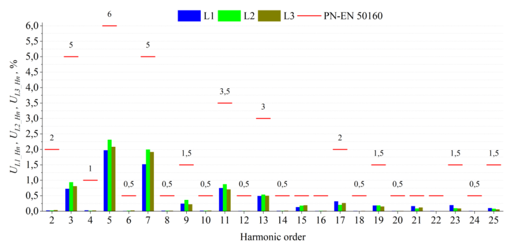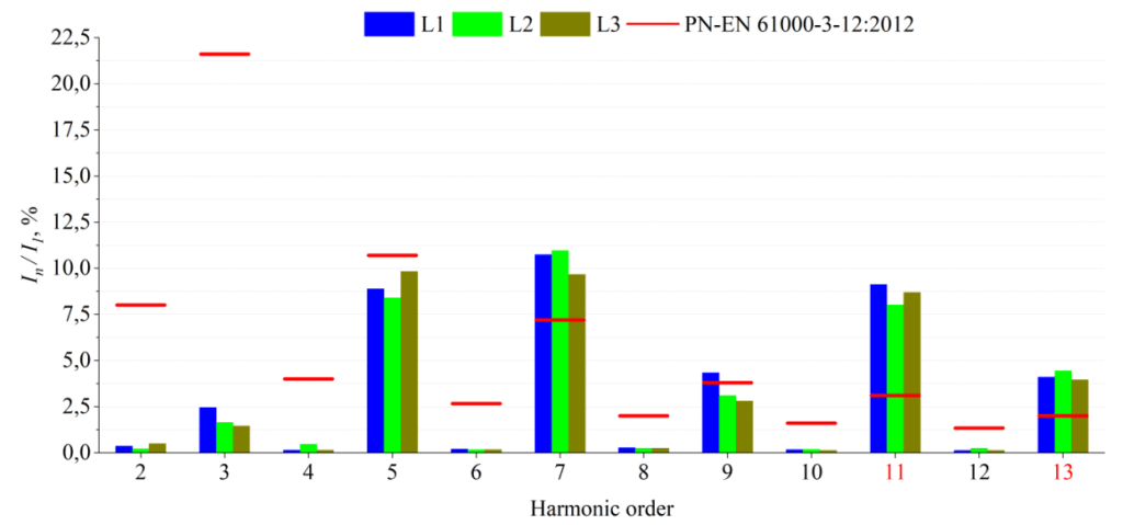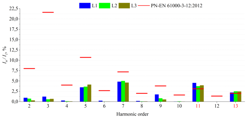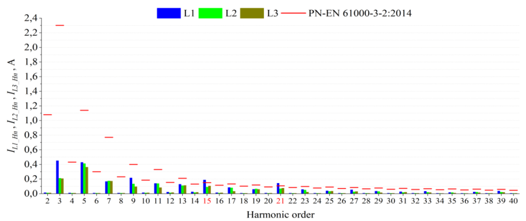 Mercedes e-Vito on-board charger (6.6 kW; < 16 A per phase) did not meet the requirements of PN EN 61000 3- 2:2014 due to excessive values of the 15th (0.19 A) and 21st (0.14 A) harmonics of the L1 phase voltage . The requirements of PN-EN 61000-3-2:2014 and PN-EN 61000-3-12:2012 were also not met for the Tesla Model 3 in both charging modes. In CC mode (Fig. 3.), the 11th (4.53% – L1, 3.74% – L2, 3.94% – L3) and 13th (2.21% – L1, 2.49% – L2, 2.46% – L3) harmonics were exceeded, while in the case of CV mode (Fig. 4.), the exceedances were for the 7th (10.75% – L1, 10.96% – L2, 9.67% – L3), 9th (4.35% – L1), 11th (9.12% – L1, 8.02% – L2, 8.69% – L3) and 13th (4.10% – L1, 4.45% – L2, 3.95% – L3) harmonics.