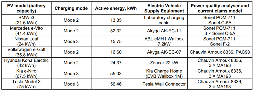 Table 1. Technical specifications: EV model, charging mode, active energy consumed, Electric Vehicle Supply Equipment, PQ analysers and measuring clamps used