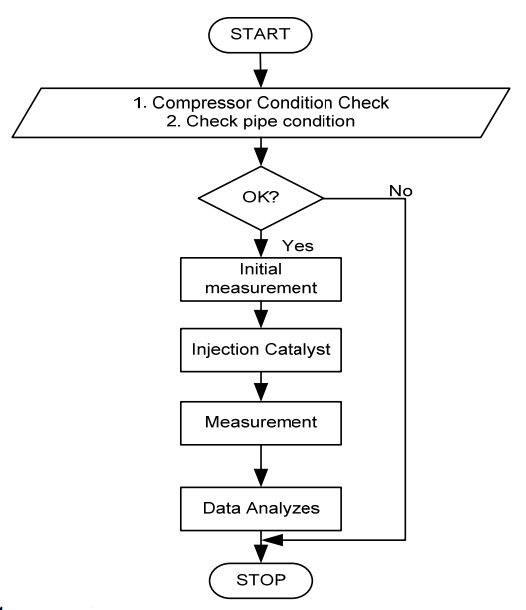 The stages in this research are given in Figure 1. Several conditions need to be considered before injecting the catalyst into the compressor. The first condition is the performance of the compressor itself. The compressor must be in good working condition and not damaged. Next, ensure that the pipe installation is in good condition. A leaking pipe will be very detrimental because the liquid gas in the compressor will run out. Next, initial measurements are carried out to measure the energy consumption of the AC unit. This research used a kWh meter to monitor initial energy consumption. After the initial measurement process, the catalyst liquid is added to the compressor. 10% of the refrigerant is removed, and the catalyst is injected [19], [20].