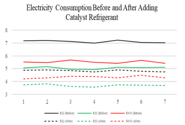 This research only looks at refrigerant catalyst’s electrical energy consumption. At the same time, the basics of catalysts and the effects and chemical reactions of refrigerant catalysts still need to be investigated. From Figure 3, using a refrigerant catalyst efficiently reduces electricity consumption, especially for the R22 type. The use of R22 is prohibited. After all, it threatens environmental sustainability because it can damage the ozone layer. Applying catalysts to cooling systems using R22 refrigerant can provide several benefits, including the potential to increase energy efficiency and reduce environmental impact. However, it should be noted that using R22 itself has been linked to environmental issues, mainly because R22 belongs to chlorofluorocarbon hydrocarbons (HCFCs), which can damage the ozone layer.
