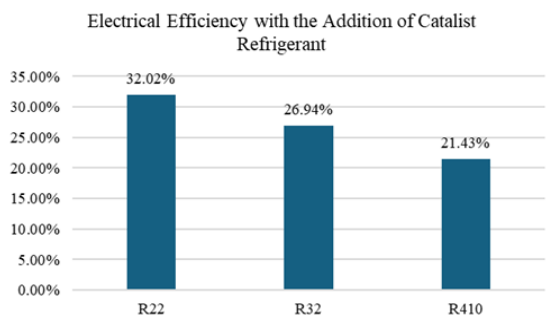 Refrigerant Catalyst use in R32 reached 26.94%. Meanwhile, the R410 needs better efficiency, around 21.43%. It is necessary to consider the application of a catalyst to this type of refrigerant because both have different and higher-pressure characteristics than R22. Safety factors need to be considered.