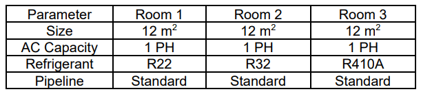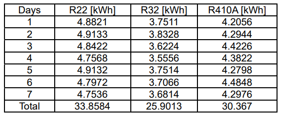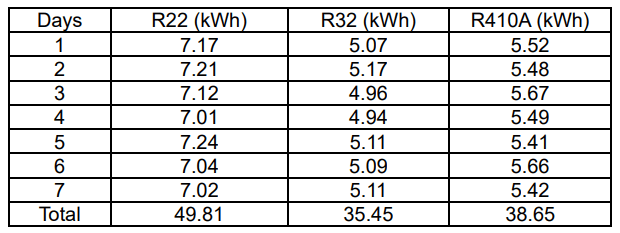The different load conditions of each room influence the amount of electrical energy consumption in Table 2. We use the existing load in the room and do not carry out detailed room load measurements. This research purely measures refrigerant performance on electricity consumption only.