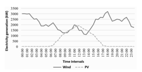 Figure 3 shows the daily production profiles of these sources. Production of PV panels peaks in the afternoon, and for the rest of the day, production is almost non-existent for some time. Similarly, wind energy production exhibits a non-permanent production behavior. It is not possible for the network to create a reliable power supply using only these two sources.
