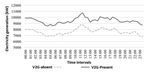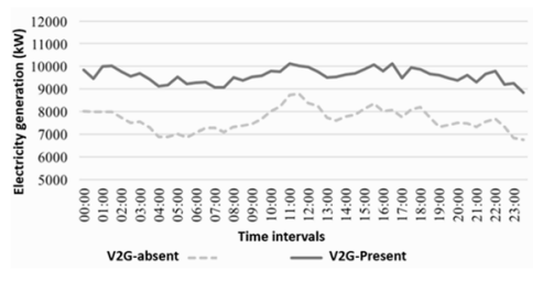 Use of small amounts of renewable energy sources. In this scenario, renewable energy sources are likely to be more limited. The reason for this restriction may be a seasonal condition or a temporary decrease in production. As a result, in such a scenario there is a maximum and stable requirement for V2G supply. The likelihood of EA participating in V2G has also been kept high for this purpose. Figure 5 shows the impact of V2G on the network in this scenario. A more balanced production profile was obtained using V2G.