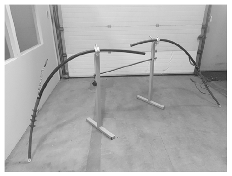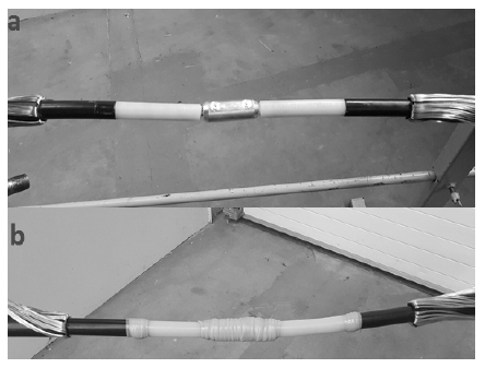There were 8 test specimens prepared for the tests. These test specimens consisted of 4 different types of cable joints, from 4 different manufacturers. Each of cable accessories types was assembled in the version according to the manufacturer’s instructions and without the electric field stress control mastic. Samples made correctly were marked with the letter “a” while the samples without the electric field stress control, with the letter “b”. Samples marked 1a, 1b, 2a, 2b, 3a, 3b and 4a, 4b were prepared.