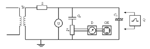 where: Tr – TP150 kV test transformer, Z – supply impedance, U – voltage measurement on the control and measurement unit, Ck – coupling capacitor, Za – impedance, D – PD SMART analyzer, OK – PC computer with software for visualization of test results, Cx – a test object [3]