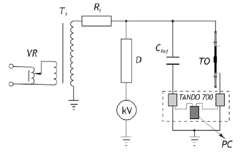 where: VR – voltage regulator, T1 – 300 kV test transformer, Rl – limiting resistor, D – voltage divider, kV – voltmeter, CRef – standard capacitor, TO – tested object, TANDO 700 – tan delta measurement system, PC – computer with software for visualization of test results