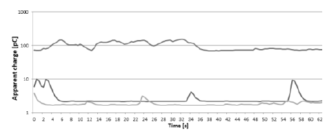 During the tests, it was confirmed that PD measurements should not be made immediately after the assembly of the test specimens, because due to the construction of the samples, the measurement results are not reliable. Diagrams 8 and 9 are showing confirmations for this conclusion.