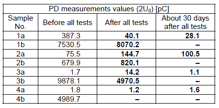 Table 1. PD results before and after dielectric loss tests and AC voltage tests