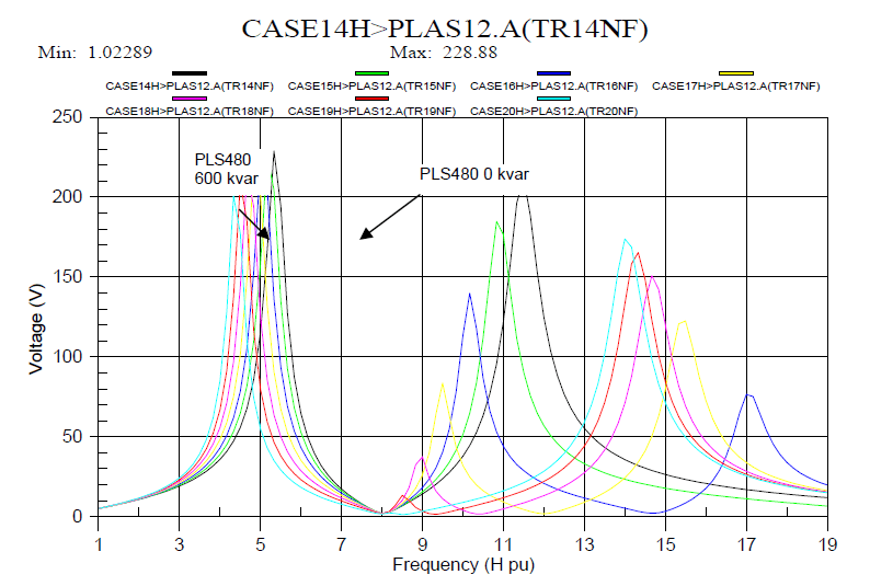 As the PLS480 capacitor banks are switched from 0 to 600 kvar, the 5th harmonic resonance shifts approximately 60 Hz (4.5th harmonic to 5.5th harmonic). Therefore, for cases in which the resonance normally occurs between the 4th and 6th harmonics, the switching of capacitors at PLS480 could result in a resonance shift such that it is tuned to the 5th harmonic.