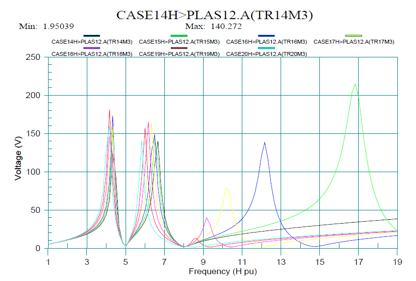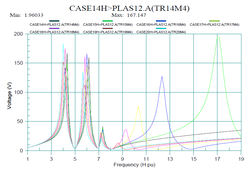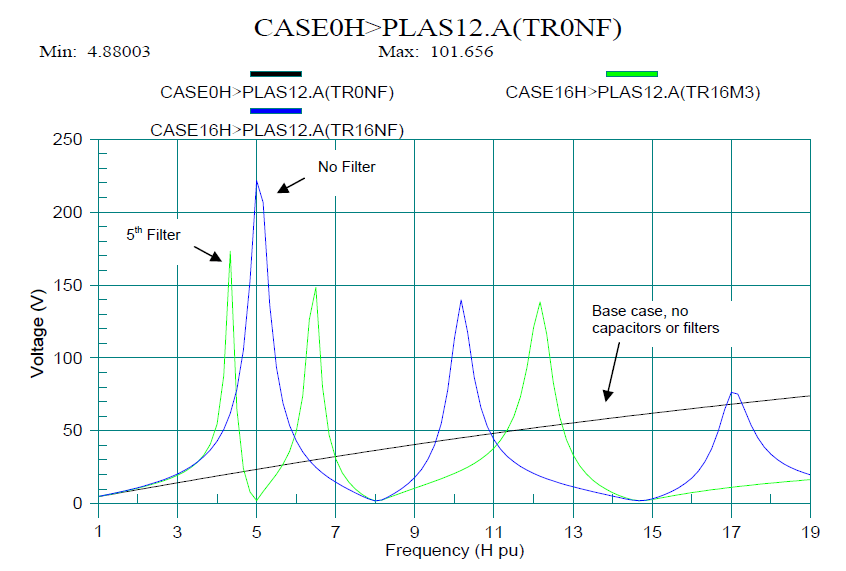 Figure 2 illustrates the frequency response of the system seen at the PLS12 bus. The base case, no capacitor system is shown as a reference. As evident in Figure 2, resonance conditions occur at both the 5th, 10th, and 17th harmonics. The extremely high resonance conditions found at the 5th harmonic would explain the high amount of 5th harmonic distortion measured on the system.