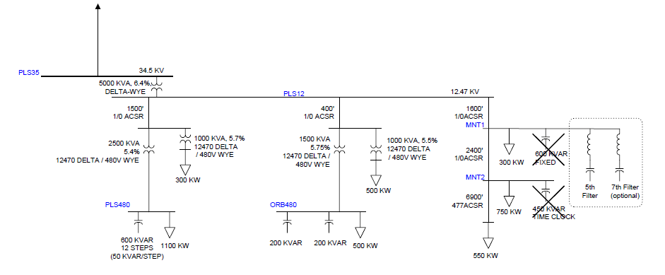 Note: The supplied compensation provided by the 5th harmonic filter is approximately 940 kvar. The total combined compensation at PLS12 is 1050 kvar (600 kvar at MNT1 and 450 kvar at MNT2). By retiring these two capacitor banks, the 1200 kvar filter will deliver the needed compensation (less 100 kvar). However, unlike the 450 kvar switched bank, the filter must be permanently fixed.