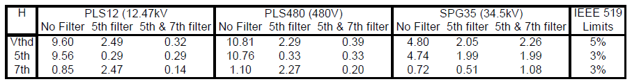 At the PLS12 12kV bus the 5th harmonic filter reduces the total harmonic distortion (THD) below the IEEE Std. 519 limits of 5% at 2.5%, with the 5th harmonic distortion falling below the 3% limit at 0.3%. However, as noted in the previous section (see Figure 5), the 5th harmonic filter can produce resonance near the 7th harmonic. This is evident with the increase in 7th harmonic distortion seen at the PLS12 bus, from 0.8% to 2.5%. With the addition of the 600 kvar 7th harmonic filter, the total harmonic distortion is reduced to 0.3%, with the 7th reaching 0.14%.