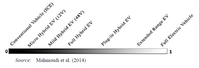 In the West, the ambiguous term electric vehicles (EVs) is commonly used and mostly associated with battery EVs (BEVs) (Chen and Midler, 2016). The EVs are classified into three major categories by their fuel consumption technology: hybrid electric vehicles (HEVs), plug-in hybrid electric vehicles (PHEVs) and battery electric vehicles (BEVs), while both PHEVs and BEVs are also referred to as plug-in electric vehicles (PEVs), since they are designed to be recharged by plugging into the power grid (Zhu et al., 2018). Hence, Hybrids (HEVs) are vehicles with an electric drive system and an internal combustion engine running on either petrol or diesel (Milowski et al., 2018), while PHEVs are vehicles equipped with at least two energy sources to propel them (Xu et al., 2018), usually by combining electric and conventional propulsion (Plötz et al., 2018) and BEVs are considered vehicles that operate on batteries that have a limited life as well as specific charging and discharging patterns (Pelletier et al., 2017). In short, the new generation electric vehicles (EVs) are likely to become increasingly popular for city travellers and are expected to feature prominently in ‘Smart Cities’ of the future (Milowski et al., 2018). Although there are other conceptualisations, Mahmoudi et al. (2014) corroborates the earlier definitions and argues in favour of a broader classification, accordingly the degree of electrification (Figure 1).