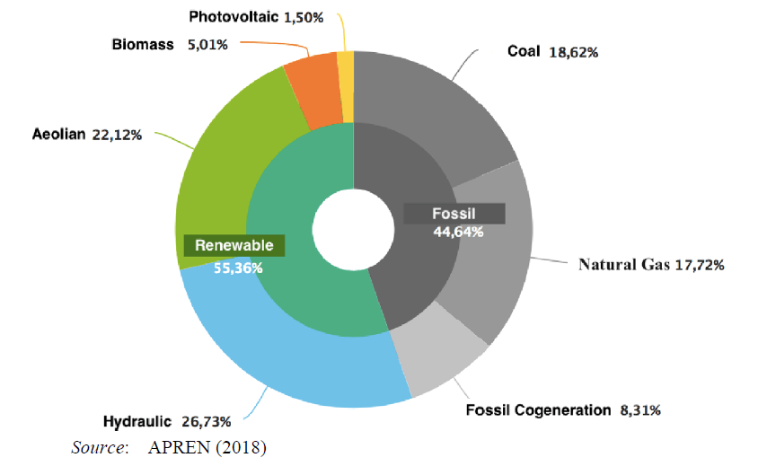 The results from Figure 2 are mainly driven by the availability of renewable resources, such as aeolian and hydraulic energy. Although the coal (18.62%) and natural gas (17.72%) are still relevant, to our best understanding, the overall result is still positive, since the production of renewable energy surpasses half of the national production of energy.