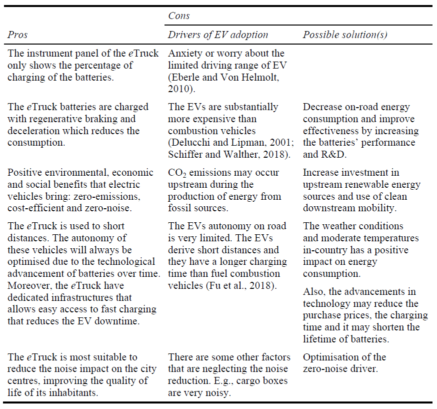 The cons the author has recorded are associated to acquisitions costs because of the low production, since the eTruck is still being in pre-test. On the other hand, for the most sceptical respondents, the autonomy of these vehicles can always be optimised with the research and development (R&D) of more efficient batteries and green technologies. These findings are in line with the literature, as scholars argue that the relatively high costs of purchase and low durability of key components (e.g., batteries) are significant barriers to the wider use of electric vehicles (Delucchi and Lipman, 2001; Schiffer and Walther, 2018). Besides major environmental advantages, the EVs have not yet managed to penetrate massively into the car market and convinced possible users (Racicovschi et al., 2007), despite the limitations the Portuguese government is trying to push and accelerating the adoption of AFVs as ecological alternatives.