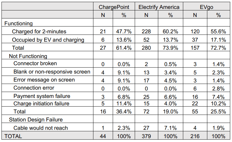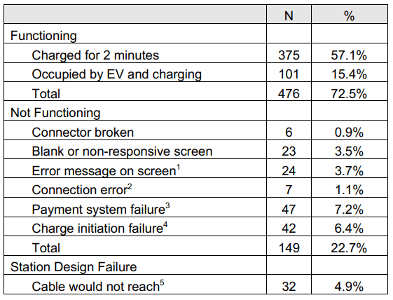 Fourth, the test methodology used did not include having the EV driver call a service number if they were unable to charge the EV. The need to call a service number for assistance might be considered by some a normally functioning system.
