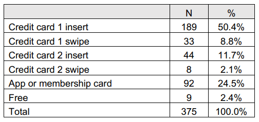 Payment Methods For the 375 EVSEs that charged for 2 minutes, the payment methods that worked are summarized in Table 4. The payment methods were tested in the order presented in Table 4. For example, 50.4% of the successful charges occurred after just the first credit card was inserted. However, 24.5% of the successful charges required an app or membership card for payment, i.e., attempts to pay with 2 credit cards were not successful.