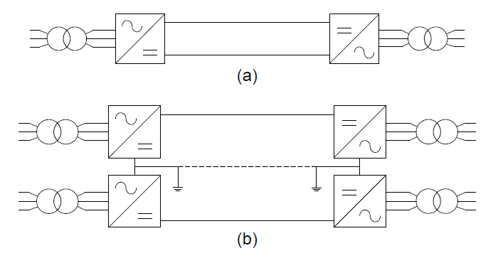 According to their topology, HVDC systems can be classified into various categories. However, for the purpose of this study, the configurations utilized are: a symmetrical monopole system, in which there is commonly no grounding system (Fig. 1a) and a bipolar system, with two converters in each end and where the returning path (with one pole out of service) can be accomplished through a metallic return or through the ground (Fig. 1b).