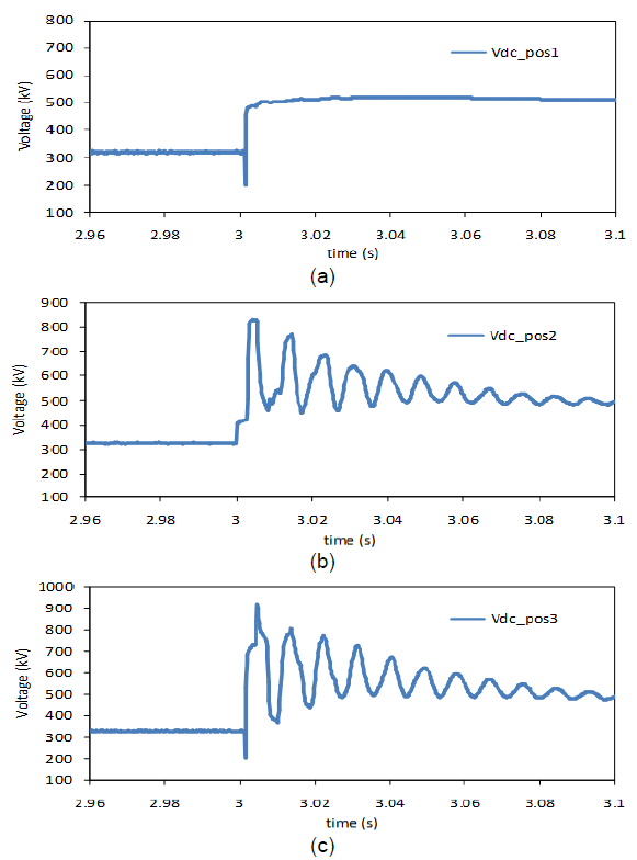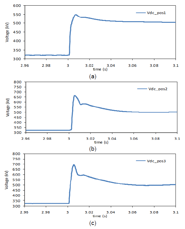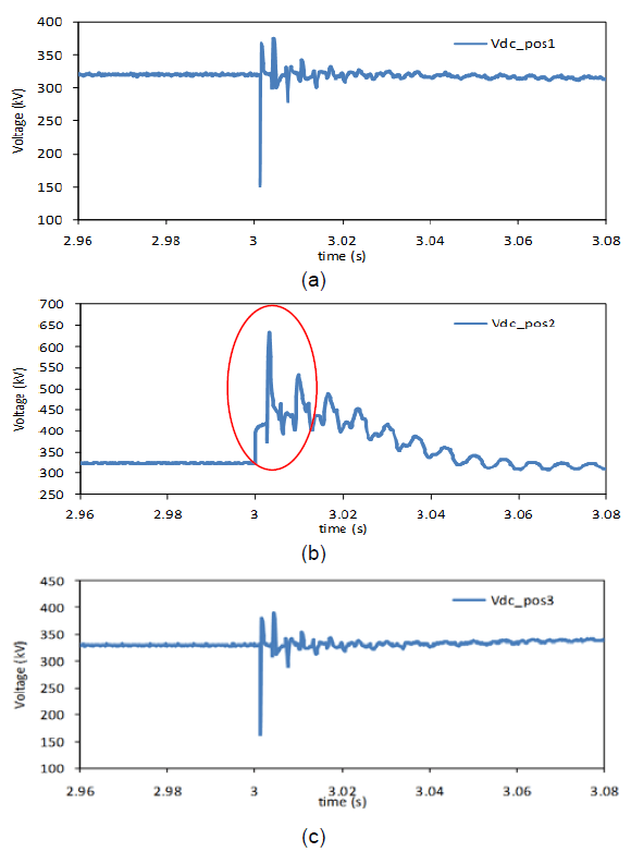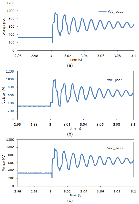 The greatest peak overvoltage at the sound pole is approximately 989 kV (Vdc_pos2 shown in Fig. 6b). In Figs.6(a) and 6(c), the values at each end of the DC line (Vdc_pos1 = 956 kV and Vdc_pos3 = 969 kV) are shown. The peak of the fault current was approximately 2.6 kA.