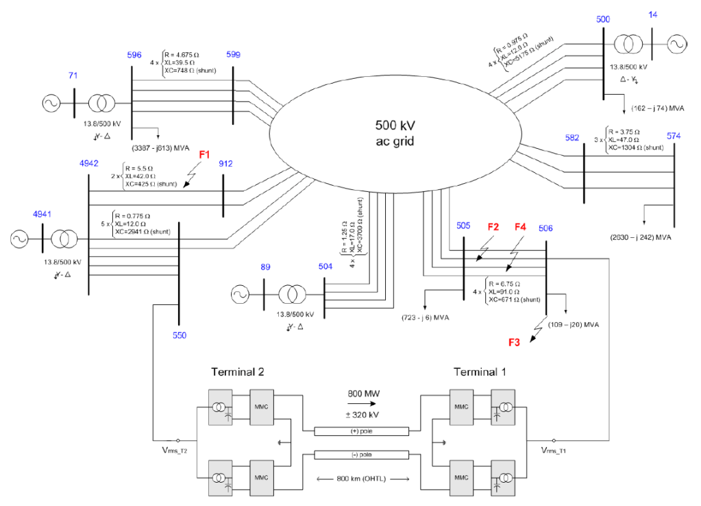 Response of the Bipolar HVDC System Towards Faults Occurring in a Nearby AC System The point-to-point bipolar system depicted in Fig. 2(a) was embedded into a digital model of an existing AC grid, whose operating voltage is equal to 500 kV (see Fig. 15). Four AC equivalent generators feed the entire AC grid (60 Hz). All of the transmission line parameters were represented through coupled pi sections to consider their values of series impedance and shunt admittance. To conduct this analysis, the set points of the transmitted power and the voltage of the point-to-point bipolar system were kept at 400 MW/pole and +/-320 kV/pole, respectively.