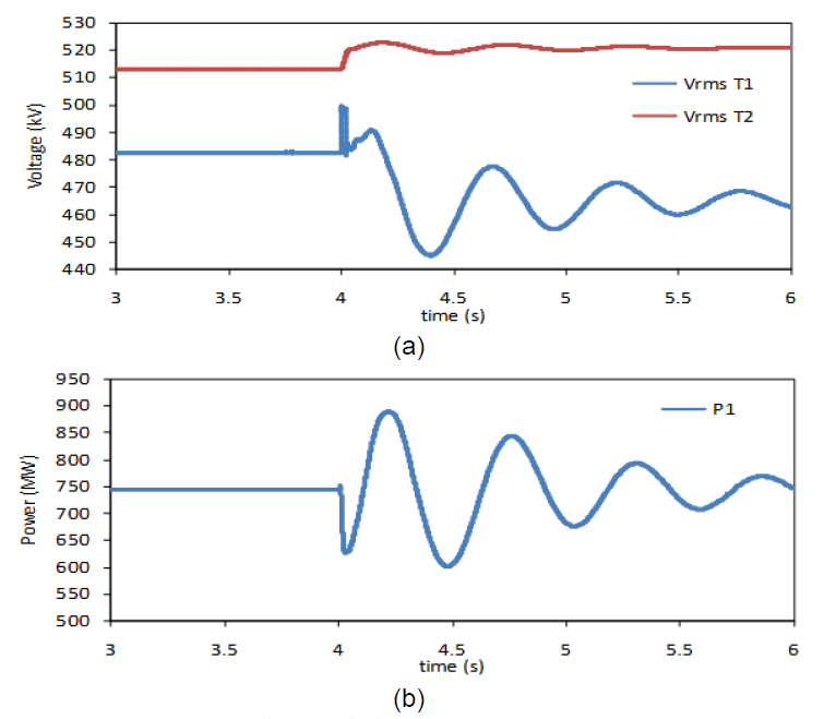 (Vrms_T1 = 482 kV & Vrms_T2 = 513 kV) are shown in Fig. 16(a). Notice that with the disconnection of the three lines between buses 505 and 506, the rms voltage at Terminal 1 (closer to the fault point) reaches a new operative point (around 460 kV) in relation to the pre-fault value (482 kV). This is partly due to the higher losses now present in the remaining line. In order to ensure a proper operation of the converters, this voltage drop will have to be compensated by the transformer tap changer.