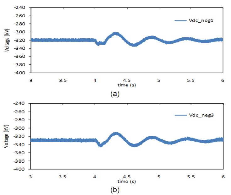 The oscillation and subsequent damping of the AC power (in around 3.0s) at Terminal 1 (P1) is shown in Fig. 16(b). Low oscillatory patterns of the voltages in the negative pole (peak values equal to Vdc_neg1 = 340 kV and Vdc_neg3 = 348 kV) were also observed for this fault (Fig. 17a and 17b, respectively). In conclusion, no significant threats over the DC link from faults occurring in a nearby ac system were found.