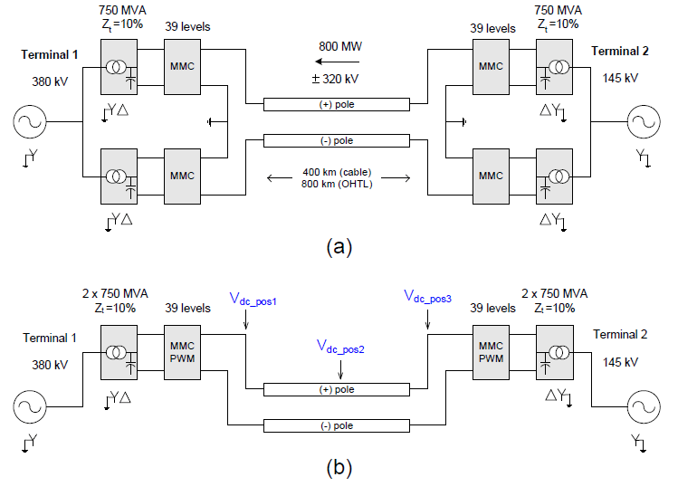 Traditionally, HVDC systems using line commutated converters (LCCs) are utilized for the transmission of bulk power over long distances. Recently, voltage sourced converters (VSCs) applied to HVDC systems also appeared as good candidates for the transmission of relatively large power (up to 1000 MW) at high voltages (up to ± 400 kV).