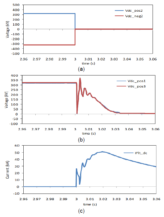 The voltage at the fault point in both sound and faulted pole (Vdc_pos2 & Vdc_neg2) falls to zero (Fig. 3a), whereas the peak overvoltages at Vdc_pos1 and Vdc_pos3 (sound pole) are 369 kV and 372 kV, respectively (Fig. 3b). The peak of the DC current (20 ms after the fault was initiated) was approximately 51 kA (Fig. 3c).