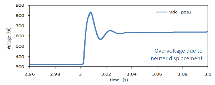 While the voltage at the negative pole (faulted pole) drops to a very low value (close to zero), the sound pole exhibits a significantly large peak overvoltage at the middle of the line (Vdc_pos2 =834 kV), as depicted in Fig. 4. The maximum overvoltages read at both the beginning and end of the sound pole (Vdc_pos1 & Vdc_pos3) were approximately 782 kV. These overvoltages are mainly due to the displacement of the (virtual) neutre in the DC link of the symmetric monopole system. Under the no fault conditions, this virtual reference is zero, with each pole operating at ±320 kV. The instant the negative pole drops nearly to zero (due to the fault) this reference is displaced; thus, resulting in higher DC voltages on the sound pole.