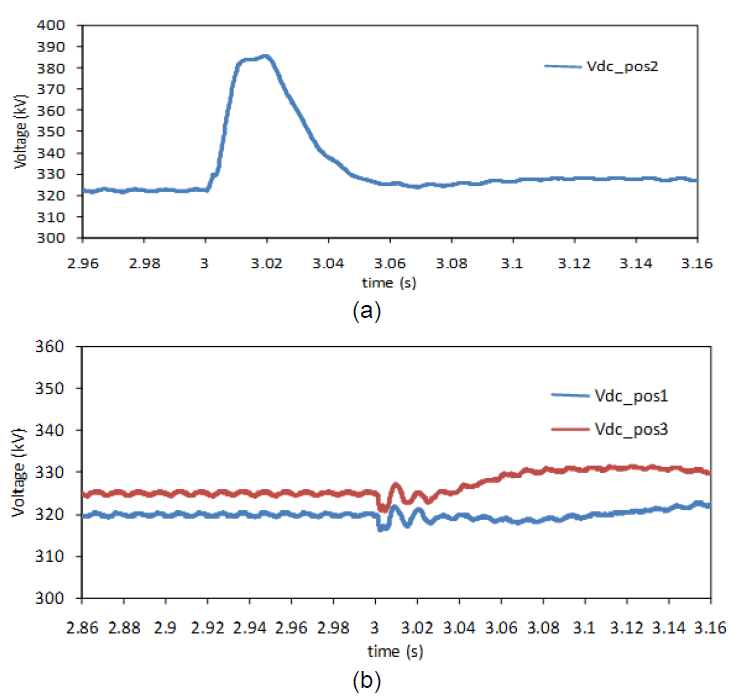 The peak overvoltage at the sound pole (Vdc_pos2) was equal to 386 kV (Fig. 5a), whereas at each end of the line relatively lower voltages (Vdc_pos1 = 323 kV and Vdc_pos3 = 332 kV) were obtained (Fig. 5b). These overvoltages can present no threat to the analysed system.