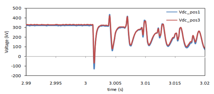 Close results to those presented in Section A.a.1 were obtained (i.e., the voltages at the middle point Vdc_pos2 and Vdc_neg2, fall to zero; whereas the values of Vdc_pos1 and Vdc_pos3 are equal to 302 kV and 305 kV, respectively). The peak fault current was equal to 33.7 kA.