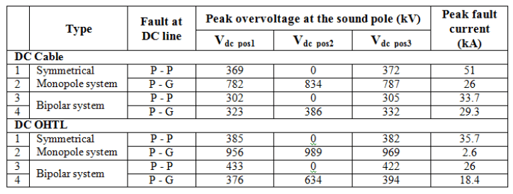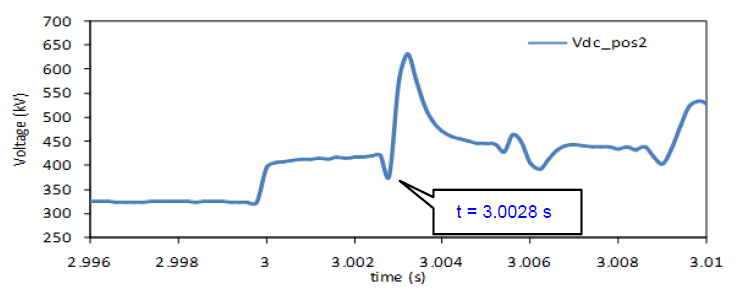 Next, the overvoltages and the behaviour of the DC link, due to the simulated faults, will be shown. The magnitude of the overvoltages at the beginning (Vdc_pos1), the middle (Vdc_pos2), and the end of the DC line (Vdc_pos3), as indicated in Fig. 2(b), will be presented. Measurements at these same points of the negative pole were also obtained. However, our main focus will be on the overvoltages created in the sound pole. A summary of all the values obtained in the study is presented in Table 1.