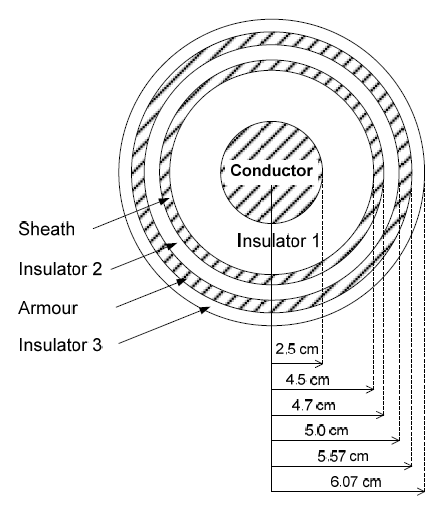 Regarding the DC link, both positive and negative cables have standard configurations, with a core (whose diameter is equal to 0.05 m), sheath and armour, as described in the Appendix section. The separation distance between both cables is 0.5 m, and the cables are buried at a depth of 1.5 m.